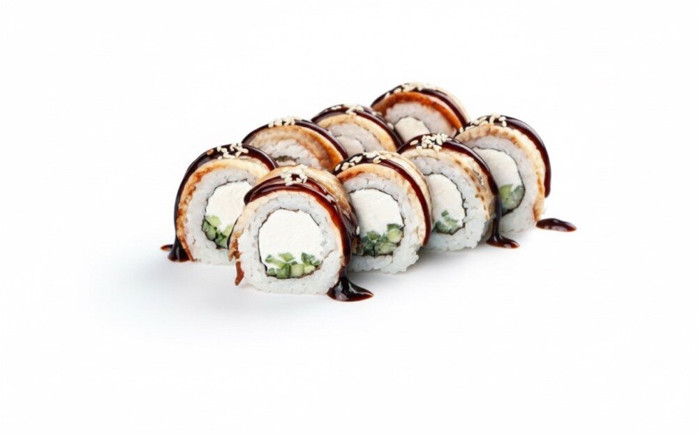 Рис SHINAKI, нори, творожный сыр, огурцы, угорь копченный, унаги соус, кунжут
