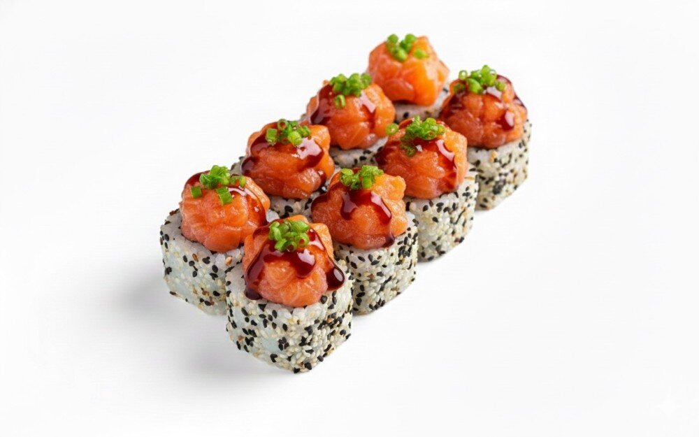 Рис SHINAKI, нори, творожный сыр, огурцы, шапочка из кусочков лосося с соусом унаги