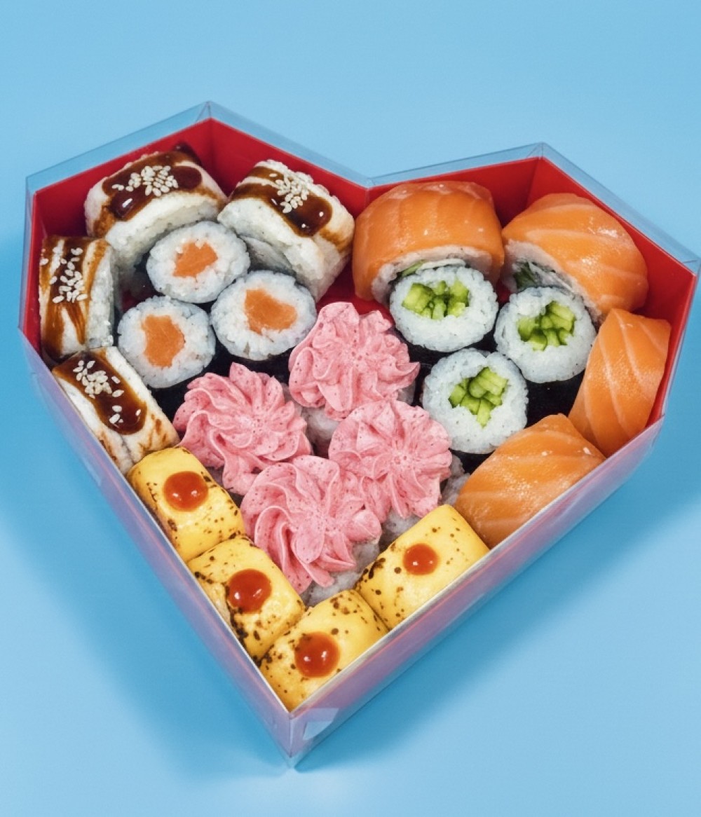 Праздничный микс в форме сердца, созданный для самого романтичного ужина. В наборе — наша Филадельфия с щедрым слоем свежего лосося, дополненная роллами с угрем, классическими маки с огурцом и лососем и нежными розовыми шапочками из сливочного крема. Подарок, который расскажет о твоих чувствах вкуснее любых слов.