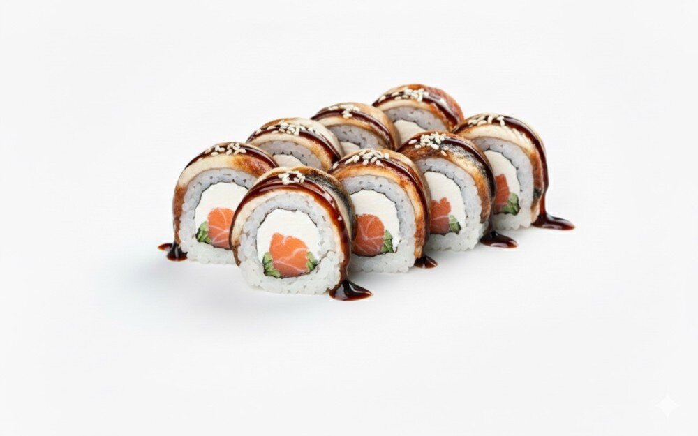 Рис SHINAKI, нори, творожный сыр, огурцы, лосось, угорь копченный, унаги соус, кунжут