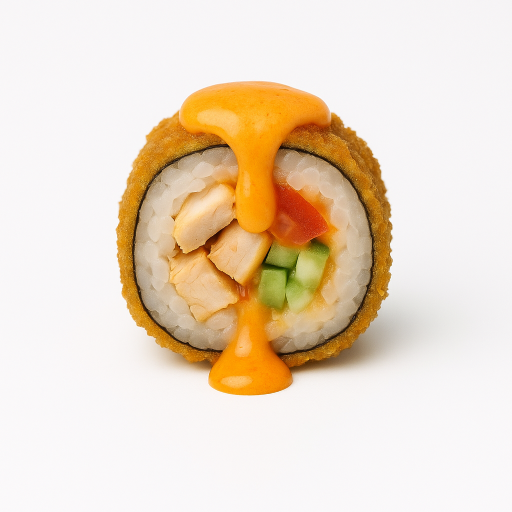 Рис SHINAKI, нори, копченный цыплёнок, огурцы, помидоры, кляр, панировочные сухари, спайси соус