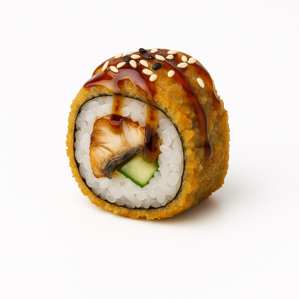 Рис SHINAKI, нори, угорь копченный, огурцы, кляр, панировочные сухари, унаги соус, кунжут