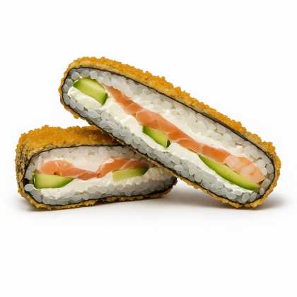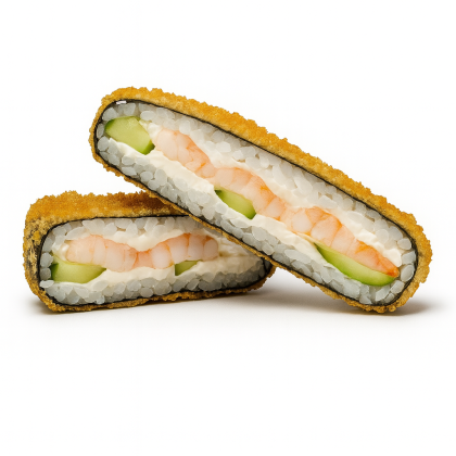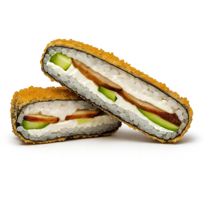 Рис SHINAKI, нори, творожный сыр, огурцы, копченный цыплёнок, кляр, панировочные сухари