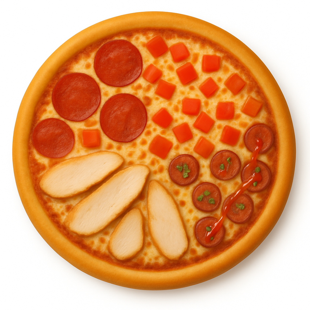 Сыр моцарелла, красный соус, копченный цыплёнок, колбаса, помидоры, охотничьи колбаски (халал))