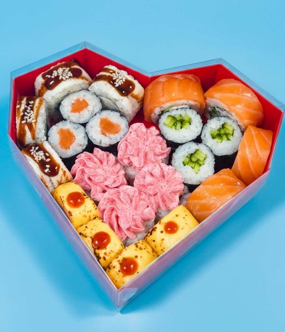 Праздничный микс в форме сердца, созданный для самого романтичного ужина. В наборе — наша Филадельфия с щедрым слоем свежего лосося, дополненная роллами с угрем, классическими маки с огурцом и лососем и нежными розовыми шапочками из сливочного крема. Подарок, который расскажет о твоих чувствах вкуснее любых слов.